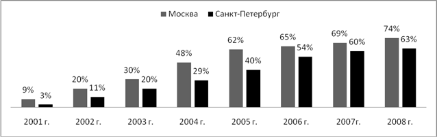 Рис. 1 Динамика доли корпоративных систем в товарообороте сферы услуг