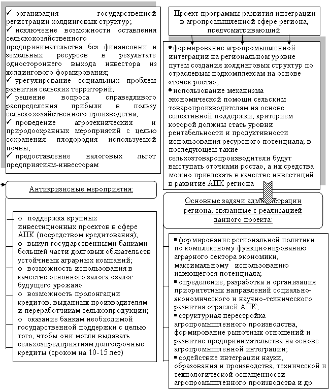 6. Одним из наиболее важных факторов повышения эффективности функционирования интегрированных структур холдингового типа, в частности, в аграрной сфере выступают меры государственной поддержки их деятельности. В целях обеспечения действенности интегрированных формирований холдингового типа в АПК должны разрабатываться и приниматься региональные программы, способствующие развитию интеграции, удовлетворению интересов всех ее субъектов и их поддержки со стороны региональной администрации.