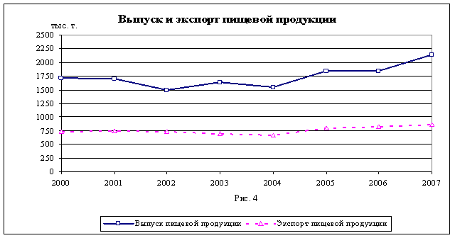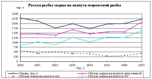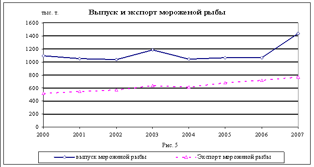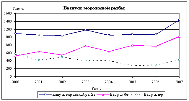 Характер поведения кривых указывает на то, что массовой модернизации в обрабатывающей отрасли не произошло. Основу объёма сохраняющейся структуры товаров составляет мороженая рыба.