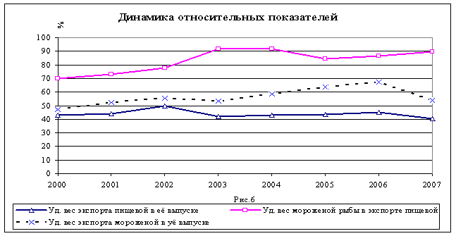 Верхняя кривая рисунка 6 отражает удельный вес мороженой рыбы в экспорте пищевой. В последние годы эта величина варьирует в пределах 85-90 %. Средняя кривая отражает долю экспорта мороженой рыбы в её выпуске. Доля составляет 50-60 %. Нижняя линия отражает удельный вес экспорта пищевой в её выпуске. Значения этого показателя составляли 40-45 %.