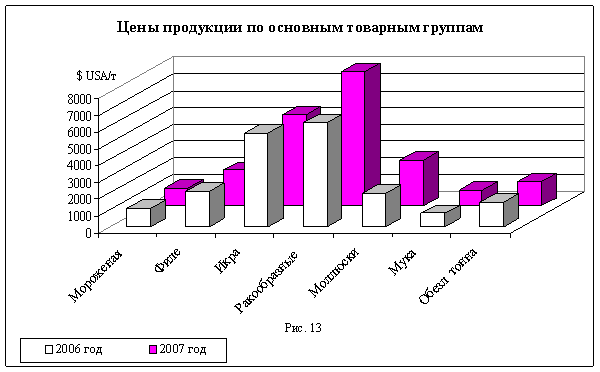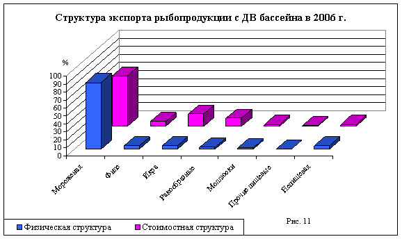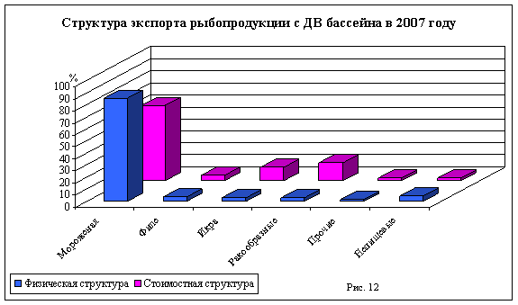 Наглядным представляется физическая и стоимостная структура экспорта рыбопродукции с ДВ бассейна, рисунки 11 и 12. Товарная группа мороженой продукции контрастно занимает доминирующее положение.
