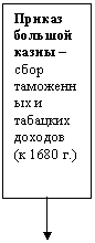 Сбор таможенных и кабацких доходов к 1680 г. был сосредоточен в Приказе Большой казны. Большая таможня и Посольская новая таможня оформляла товары иноземцев. В Мытную избу предъявлялись к обложению пошлиной скот, сено и др. Конюшенный приказ надзирал за торговлей лошадьми. Померная изба оформляла сделки на зерно, овощи и другие товары.