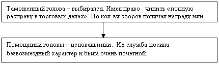 Возглавлял таможню таможенный голова, который выбирался из гостей, торговцев, посадских или государевых крестьян и рассматривался как представитель правительства, имеющий право чинить “полную расправу в торговых делах". За превышение сумм сборов он получал награду, за снижение поступлений с него взыскивался ущерб. При нем состояло несколько помощников - целовальников. Служба головы и целовальников носила безвозмездный характер и считалась очень почетной. Помимо целовальников купцам помогали дьяки и подьячие, которые работали по найму и записывали в таможенные книги данные о товарах, хозяине, суммах сборов.