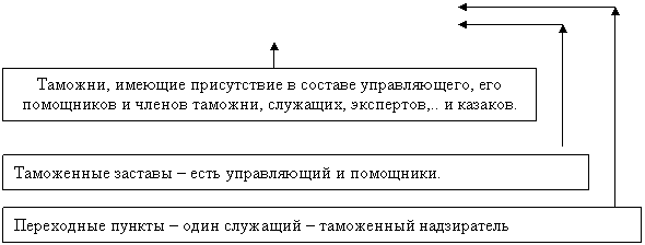 Таким образом, к началу ХХ века таможенные учреждения представляли следующую систему. Низшим звеном были переходные пункты, единственным служащим которых был таможенный надзиратель. Крупнее были таможенные заставы в составе управляющего и помощников. Более крупными учреждениями были таможни, имевшие присутствие в составе управляющего, его помощников и членов таможни, служащих — надзирателей, смотрителей, казначеев, секретарей, экспертов и др., а также нижних чинов — казаков. Таможни входили в таможенные округа, а некоторые, наиболее крупные таможни подчинялись непосредственно Департаменту таможенных сборов Российского Министерства финансов, например, Архангельская таможня, Московская таможня. Помимо пограничных таможенных учреждений, расположенных на сухопутных, морских, железнодорожных путях, открытых для движения товаров через таможенную границу, существовали внутренние таможни — для досмотра товаров, следующих внутрь страны и осмотренных на границе только внешне (таковыми являлись Московская, Санкт-Петербургская, Челябинская, Красноярская, Иркутская, Сретенская и другие таможни).