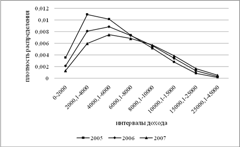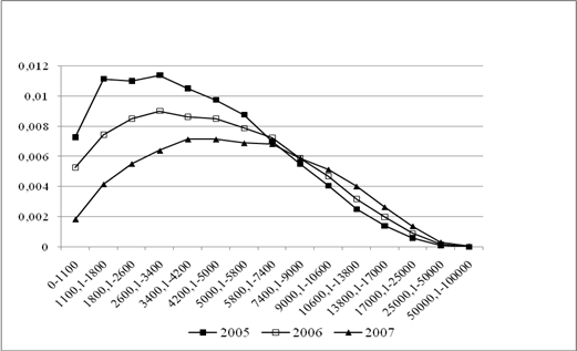 Наибольший интерес анализ распределения индивидов и домохозяйств по размеру доходов представляет с точки зрения определения размера и возможностей формирования среднего класса. Исследование характера и тенденций распределения доходов в данной работе показывает, что в обществе всегда существует реальная возможность формирования среднего слоя, поскольку есть некоторая срединная часть кривой, если даже экономические субъекты, «попадающие» в соответствующие интервалы дохода в связи со значительной асимметрией, и не присваивают средний доход (рис. 7). Её можно интерпретировать как существование в любой отрезок времени самого массового, базового слоя общества. Этот слой общества нельзя назвать средним классом в западном понимании, так как в нынешних российских условиях размер доходов здесь, преимущественно, ниже среднего. Все дело в средней величине дохода и его модального уровня, которые должны расти, но при этом сближаться, чтобы создавать реальные материальные предпосылки для формирования стабильного среднего слоя.