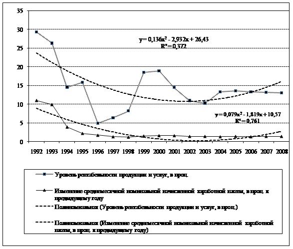 Временные тренды были выявлены для всех характеристик за исключением двух показателей – величины реальных денежных доходов по отношению к предыдущему периоду и доли оплаты труда в ВВП. Имея в виду, что главная тенденция в изменении какого-либо параметра отражает влияние постоянных факторов, а остаточные значения фактических уровней динамического ряда – некоторых случайных характеристик, можно говорить о том, что изменение ряда параметров уровня и характера распределения доходов экономических субъектов происходит, в частности, вследствие регулирующего воздействия общества как некоторой постоянной составляющей. Однако главные макроэкономические характеристики процесса формирования доходов – доля наёмного труда в составе ВВП и реальные денежные доходы – менее всего регулируются государственными структурами. Меры и способы проведения социальной политика государства, следовательно, ещё не приобрели свойство устойчивости, не вполне логичны и адекватны реально существующим проблемам. В современном российском обществе ещё не сложился механизм, вследствие действия которого происходило бы движение общества по пути преодоления глубокой дифференциации в доходах экономических субъектов. В качестве необходимых общих условий конструирования такого механизма необходимо рассматривать наращивание темпов роста ВВП, отсутствие высокой инфляции, повышение уровня прибыльности предприятий и размера социальных гарантий.