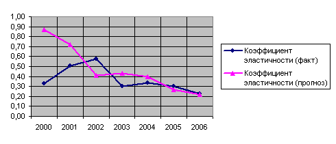 Коэффициент эластичности инфляции показывает насколько эластично или неэластично изменяется индекс инфляции. Как правило, при значении коэффициента эластичности инфляции меньше единицы, инфляция неэластична или слабоэластична. На практике редко встречается, когда индекс роста денежного предложения в течение относительно длительного времени (до 3 лет) меньше индекса роста цен. В краткосрочном периоде подобное происходит, но в средне - и долгосрочном периодах на практике почти не встречается. Наш анализ с помощью коэффициента эластичности инфляции, очевидно, показывает, что по крайней мере за рассматриваемый период прямой пропорциональной зависимости между ростом М2 и ростом цен не обнаружено. Об этом свидетельствуют данные и расчеты, представленные в таблице 1, и построенные на их основе графики, отраженные на рисунке 1.