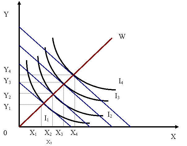 С ростом реального дохода потребителя бюджетное ограничение сдвигается последовательно в положение В1, В2, В3, В4. Точки касания кривых безразличия с бюджетными ограничениями показывают последовательные положения равновесия потребителя в соответствии с ростом его реального дохода.