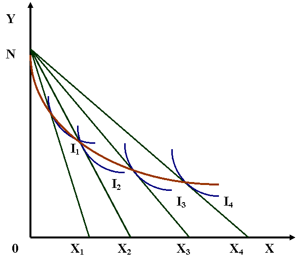 Допустим, что цена блага Х снижается, т. е. Рх1>Рх2>Рх3>Рх4. На графике это соответствует сдвигу бюджетного ограничения последовательно из точки Х1 в точки Х2, Х3, Х4.
