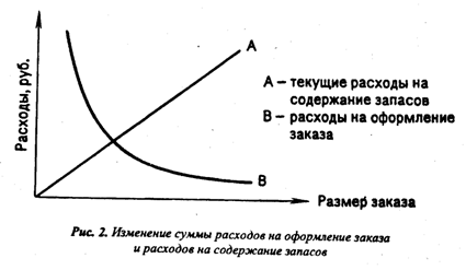 1. Стоимость оформления заказа. Здесь возникают как постоянные, так и переменные затраты. Постоянные расходы - это заработная плата работников отделов снабжения, вложения в оборудование и накладные расходы, рассчитанные на определенный объем сырья. Переменные расходы зависят от способа оформления заказа, стоимости пересылки документов, увеличения числа заказов и т. д.