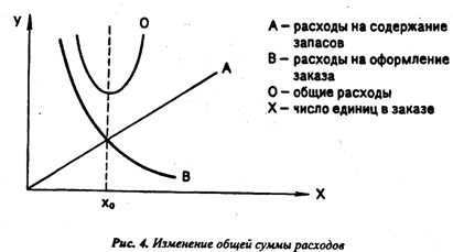 Допустим, мы имеем число единиц, закупаемых в результате одного заказа - "х". По мере того, как число единиц (х), закупаемых за один раз, возрастает, текущие расходы на содержание запасов также увеличиваются. Но вместе с тем, если число единиц в одном заказе увеличивается, очевидно, количество заказов при постоянных объемах производства уменьшится, что приведет, естественно, к уменьшению расходов на оформление заказа. Эти изменения можно видеть на рис. 2.