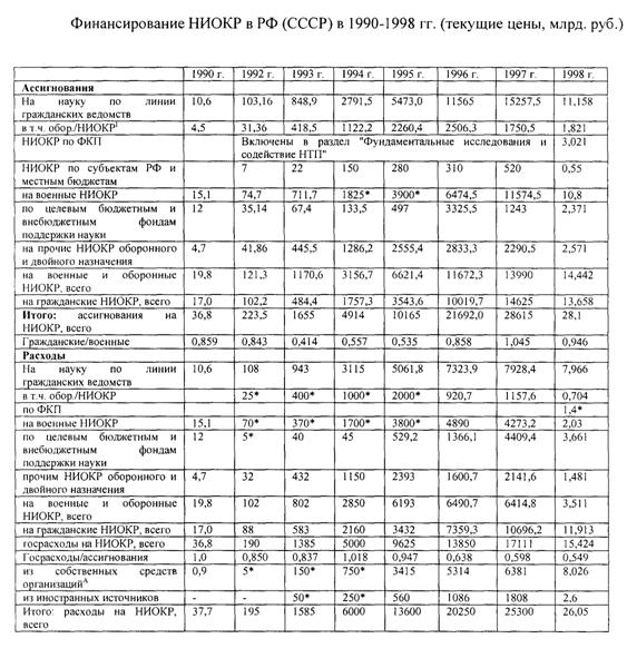 Данные, приведенные в табл. 1, достаточно полно, с финансовой точки зрения, иллюстрируют процессы распада советской системы поддержки науки и механизма освоения результатов НИОКР в сфере материального производства. Так, в 1999 г.. несмотря на некоторое реальное увеличение расходов на науку, они в сопоставимых ценах составили всего 18,3% от уровня 1991 г. Интересно отметить также степень милитаризации российской науки: в послереформенное время наиболее милитаризированным оказался 1993 г. За гг. фиксируется тенденция постепенного повышения доли гражданских НИОКР в общих расходах на науку, которая была временно прервана в 1999 г., когда впервые за годы рыночных реформ в абсолютных цифрах существенно выросли затраты на военные НИОКР. Государственные расходы в гг. в сопоставимых ценах вырастут в 2,23 раза по сравнению с 1998 г. В последние два года темпы роста финансирования науки немного замедлились. Так, в 19гг. средние ежегодные темпы приростов финансирования науки составляли около 15%, то в гг. они составят порядка 14%.