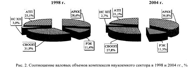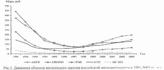Структура сектора. Темпы роста агрегированных сегментов наукоемкого рынка показаны на Рис.1. Развитие наукоемкого сектора российской промышленности в 90-годы ХХ в. и в 20гг. (см. рис.1) распадается примерно на два периода: трансформационного кризисного развития в гг.; посткризисного роста в гг. С 2003 г. наблюдаются признаки инвестиционного роста наукоемкого сектора.