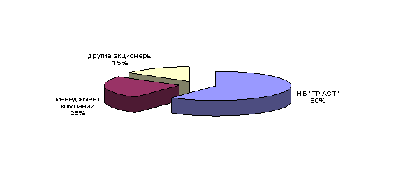 Контрольный пакет акций Межрегиональной факторинговой компании «ТРАСТ» находится у НБ «ТРАСТ» ( 60% от общего количества акций), 25% акций находится у менеджмента компании и 15% у других акционеров.[52] Графически распределение уставного капитала между акционерами представлено на рис.1.
