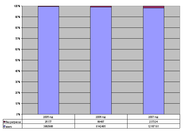 Анализируя данные на рис.3, можно сказать, что операции без регресса в 2007 году составили в общем объеме 2,91%. Это на первый взгляд очень мало, но с учетом того, что в 2005 году этот показатель был равен 0,45%, то результат за 2007 год можно считать высоким. Следовательно, при сохранении этой тенденции доля факторинга без регресса в общем объеме операций будет расти с каждым годом.