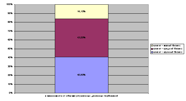 Сравнивая структуру факторинговых сделок по размеру бизнеса клиентов за 2007 год и за 2006 год, изменения можно заметить лишь по пропорциям, отражающим объем требований, уступленных компаниями-представителями различных размерных классов (см. рис.5 и рис.6).