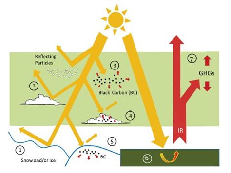 Для «черного углерода» важны три эффекта. Во-первых, прямое поглощение солнечной радиации (3). Во-вторых, загрязнение облаков, что приводит как к поглощению солнечной радиации и прогреву облаков (4). Этот эффект приводит и к уменьшению количества осадков в регионах, где облака загрязнены. Это прямые эффекты, которые наиболее сильны в южной и восточной части Азии, в тропической Африке, Латинской Америке. Указанные два процесса (3 и 4) «конкурируют» с загрязнением атмосферы взвешенными частицами, которые более отражают, чем поглощают солнечную радиацию, что дает затенение и охлаждение планеты (2).