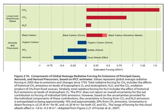 Относительный вклад различных веществ в глобальный прогрев или охлаждение атмосферы, в частности, в 2005-ом году можно проиллюстрировать с помощью показанной ниже диаграммы (источник http://www. epa. gov/blackcarbon). Видно, что в целом на Земле антропогенное загрязнение атмосферы приводит к нетто-прогреву атмосферы. Следуя данной диаграмме, сумма «нагревателей» равна примерно 3 Вт/м2, а сумма «охладителей» - около 1,3 Вт/м2.