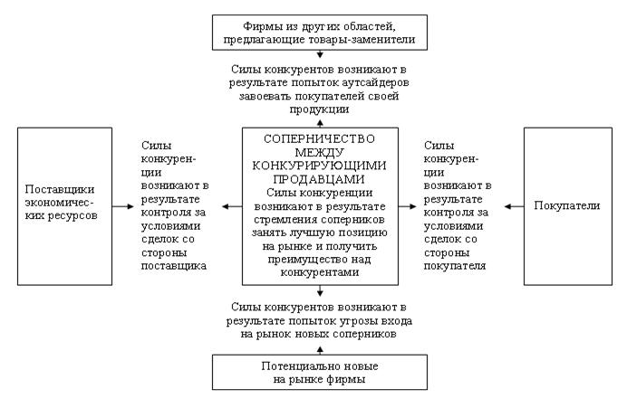 Модель пяти сил (направлений) конкуренции – это эффективный метод анализа основных конкурентных сил, влияющих на положение фирмы на рынке. Эта модель дает возможность более целенаправленно оценить конкурентную обстановку на рынке и на этой основе разработать такой вариант долгосрочной стратегии фирмы, который в наибольшей мере обеспечит ее защиту от воздействия конкурентных сил и одновременно будет способствовать созданию дополнительных конкурентных преимуществ.