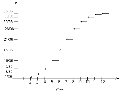 Пример 1. Функция распределения величины X, равной числу выпавших очков после двух бросков игральной кости (пример 4), имеет вид, показанный на рис.1.
