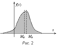 Определение 6. Модой Mо(X) непрерывной случайной величины является то её значение, в котором плотность вероятности максимальна. Медианой Mе(X) непрерывной случайной величины называется абсцисса точки, в которой площадь, ограниченная кривой распределения, делится пополам (рис. 2).