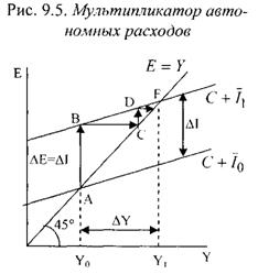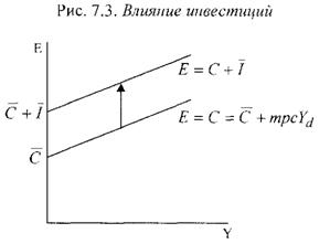Аналогичные рассуждения применимы и к изменению (автономных) инвестиционных расходов. Увеличивая инвестиции, фирма закупает инвестиционные товары, создавая доход их производителю, который в свою очередь расходует часть этого дохода на потребление, обеспечивая до-