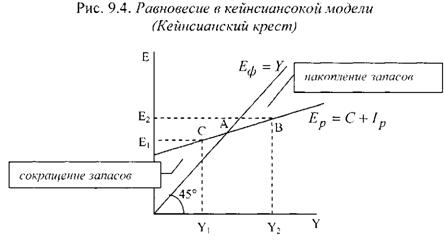 Равновесие расходов и дохода, т. е. равновесие товарного рынка находится в точке пересечения двух кривых (т. А). В этой точке: 1) планируемые расходы равны выпуску (доходу): Е р = Y; 2) фактические расходы равны планируемым расходам: Е = Ер; 3) инъекции равны изъятиям: / = S; 4) планируемые инвестиции равны сбережениям: Iр = S