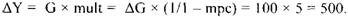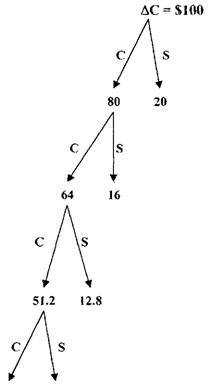 Предположим, что домохозяйство увеличивает свои автономные расходы на $100, т. е. покупает на эту сумму товары и услуги. Это означает, что производитель этих товаров и услуг получает доход в $100, который он тратит на потребление и сбережения. Предположим, что предельная склонность к потреблению мрс = 0.8, что означает, что из каждого дополнительного 1 доллара дохода экономический агент тратит на потребление 80 центов (т. е. 80%), а 20 центов (т. е. 20%) сберегает (т. е. предельная склонность к сбережению mps = В этом случае, получив $100 дополнительного дохода, производитель потратит $80 на потребление (Y х трс =100 х 0.8 = 80) и $20 пойдут на сбережения (Y х mps = 100 х 0.2 = 20). Потраченные им на потребление (на покупку товаров и услуг) $80 создадут дополнительный доход еще одному продавцу, который в свою очередь потратит $64 на потребление (Y х трс = 80 х 0.8 = 64) и $16 сбережет (соответственно 80 х 0.2 = 16) и т. д. Процесс будет продолжаться до тех пор, пока прирост расходов не дойдет до 0.