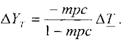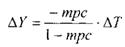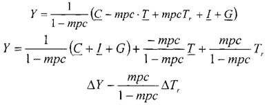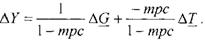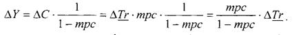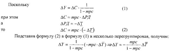 Чтобы вывести формулу мультипликатора трансфертов, вспомним, что изменение трансфертов означает изменение располагаемого дохода:![]()