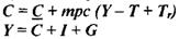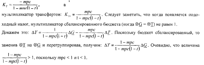 Алгебраический вывод формулы мультипликатора трансфертов. Поскольку в простой кейн-сианской модели предполагается, что трансферты получают только домохозяйства, то изменение трансфертов действует на потребительскую функцию, которая с учетом трансфертов выглядит следующим образом: