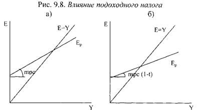 Величина мультипликатора при наличии ставки подоходного налога меньше, чем при его отсутствии (очевидно, что ((1 - mpc (1 - t) > (1 - трс), а, как известно, чем больше знаменатель дроби, тем дробь меньше, т. е. 1 / (1 - mpc< 1 / (1 - трс). Покажем это на числовом примере. Предположим, что трс = 0.8, t = 0.1 (т. е. 10%). При отсутствии подоходного налога мультипликатор расходов равен 5(1/= 5), а при появлении подоходного налога мультипликатор равен 3.57 (1/(1-= 3.57).