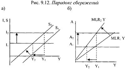 Поскольку в кейнсианской модели сбережения положительно зависят от уровня дохода, а инвестиции - величина автономная, то кривая сбережений имеет положительный наклон, а кривая инвестиций - горизонтальна (рис.7.12.(а)). Рост сбережений ведет к сдвигу кривой сбережений влево-вверх от Si до S2. Если величина инвестиций не меняется, то рост сбережений ведет к сокращению совокупного дохода (выпуска) от Y| до Y2 Таким образом в результате роста сбережений происходит ухудшение экономической ситуации.