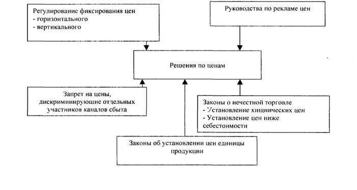 Фиксированные цены. Правительство ограничивает возможности фиксации цен по горизонтали и вертикали. Горизонтальное фиксирование цен порождается соглашениями между производителями, между оптовой или розничной торговлей по установлению цен на данном уровне канала сбыта. Такие соглашения незаконны согласно антитрестовскому законодательству независимо от того, насколько это «разумные» цены.