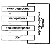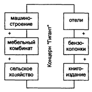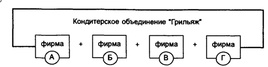 а) Горизонтальная интеграция (рис. 3) - это объединение фирм, производящих однотипную продукцию, б) Вертикальная интеграция охватывает предприятия, связанные единой производственно-сбытовой цепочкой (рис. 4). в) Наконец, конгломератная интеграция (рис. 5) имеет место тогда, когда создаются так называемые КОНГЛОМЕРАТЫ[2] - объединения фирм, производящих разные товары и услуги. При этом процесс расширения номенклатуры выпускаемой продукции называется диверсификацией[3] производства. Она часто привлекает фирмы тем, что позволяет гибко маневрировать хозяйственными ресурсами, перебрасывая их из низкоприбыльных в высокоприбыльные отрасли. Одновременно недобор прибылей на одних хозяйственных участках компенсируется повышенными доходами в других сферах бизнеса.