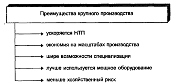 Результатом хозяйственной интеграции является крупное производство. В целом укрупнение производства - закономерный и прогрессивный процесс. Оно 1) ускоряет НТП, 2) дает экономию затрат благодаря крупномасштабности производства массовой стандартной продукции, 3) увеличивает возможности специализации, 4) повышает эффективность использования мощного оборудования (подъемных кранов, гигантских прессов, комбайнов и т. п.) и 5) уменьшает хозяйственный риск. Эти преимущества крупного производства наглядно отражены на рис. 6. Однако укрупнение предприятий эффективно до определенного предела, за которым производство становится громоздким, негибким, трудноуправляемым и экономически нецелесообразным, так как начинают возрастать средние издержки фирм.