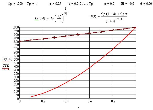 Д) Рынок пассивен (эластичность El = -0,6), вернуть кредит при затратах z=0,1 возможно, если кредит был выдан ниже рыночной стоимости (скидка d=0,15), в течение 0,97 года, объявив цену продажи 943: