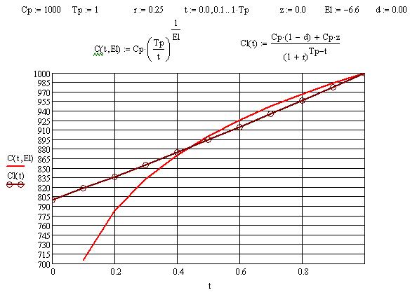 Б) Рынок активен (эластичность El = -6,6), вернуть кредит, выданный без скидки (d=0), возможно в течение 0,43 года, снизив цену продажи до 881 (затраты по продаже z=0):