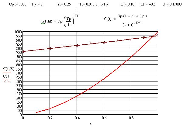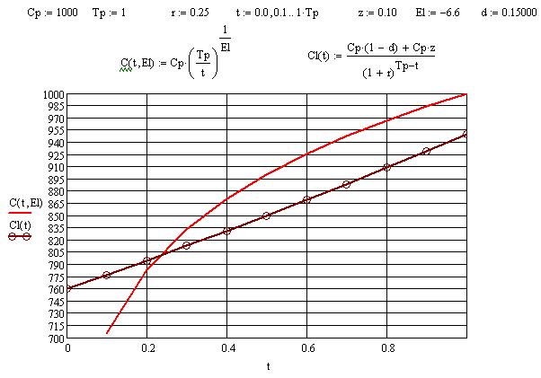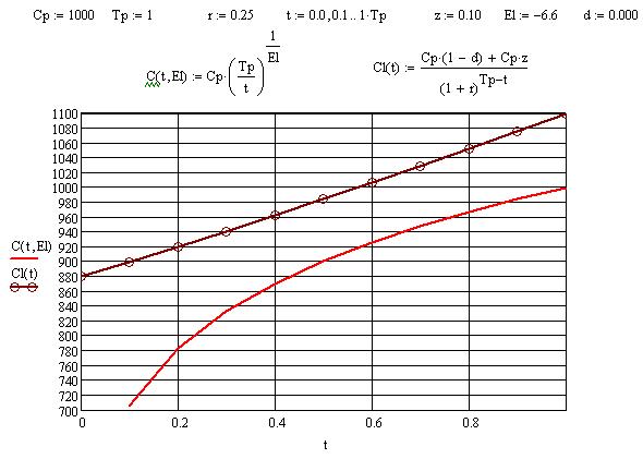 Таким образом, стоимость С объекта при вынужденной его продаже в срок t, меньший, чем срок Тр его продажи в рыночных условиях, зависит как от соотношения этих сроков, так и от эластичности El спроса по цене.
