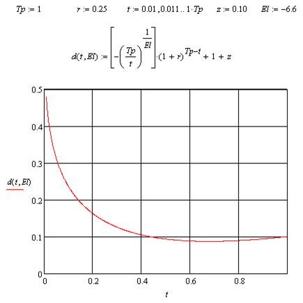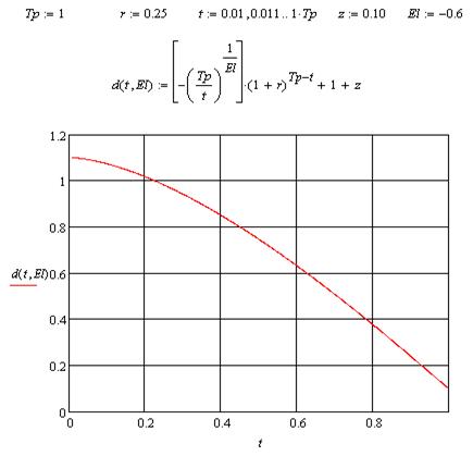 Е) Зависимость величины скидки от желаемого времени продажи (рынок пассивен (эластичность El = -0,6), затраты z=0,1):