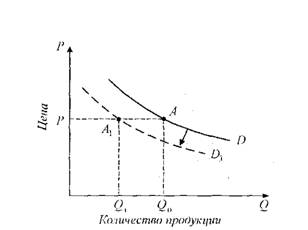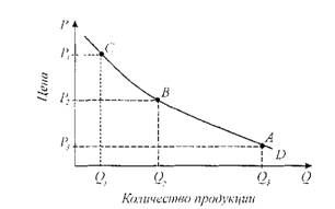 Данная кривая является кривой спроса на конкретный товар. Каждая ее точка показывает величину спроса при каждом уровне цены. Наклон кривой спроса свидетельствует об обратной зависимости величины спроса от цены. Движение по кривой спроса показывает изменение величины спроса. При движении от точки А к точке С величина спроса уменьшается в соответствии с ростом цены, при движении от точки С к точке А - возрастает по мере уменьшения цены данного товара.