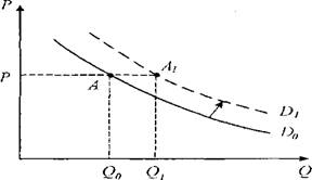 Рассмотренная кривая спроса отражает зависимость между ценой и величиной спроса на данный товар. Но в экономике могут происходить процессы, влияющие на изменение спроса без изменения цены товара. Потребители могут проявить готовность купить большее или меньшее количество данного товара по старым ценам. В этом случае меняется весь объем спроса при данном уровне цен. Графически эти изменения будут отражаться сдвигом всей кривой спроса: вправо - в случае роста спроса, влево -