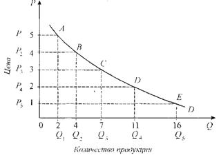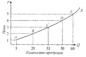 Каждая точка кривой предложения показывает значение объема предложения при данном уровне цены. При движении от точки А к точке Е величина предложение возрастает по мере роста цены, а при обратном движении уменьшается одновременно с падением цены. Двигаясь по кривой предложения, можно определить величину предложения для каждого уровня цены.