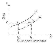 S1 - предложение при росте цена на ресурсы (Q1 < Q0; Р - const).