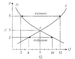 Проанализировав эту таблицу, можно увидеть, что, например, при цене, равной 5, величина спроса, представленного на данном рынке, значительно меньше, чем величина предложения, а при цене, равной 1, производители предлагают рынку значительно меньшее количество продукта, чем то, которое потребители готовы купить. На практике цена, равная 5, может просуществовать на рынке лишь какое-то незначительное время, так как значительный избыток предлагаемого товара при отсутствии достаточного платежеспособного спроса на него заставит производителей снизить продажную цену, например, до 4. Это приведет к сокращению разрыва между спросом и предложением. Полное соответствие спроса и предложения, их равенство достигается лишь при единственном значении цены - 3. Именно при этом уровне цены достигается рыночное равновесие. Графически взаимодействие спроса и предложения выглядит следующим образом (рис. 3.7).