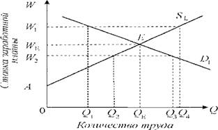 При любом другом уровне заработной платы равновесие на рынке труда нарушается. Так, если заработная плата составляет W1 (W1 > WE), предложение труда превышает спрос на труд, возникает избыток предложения рабочей силы, равный Q1 Q4, и происходит отклонение от полной занятости. Если заработная плата равна W2(W2< We), спрос на рынке труда превышает предложение труда на величину Q2 Q3 и образуются свободные рабочие места вследствие нехватки работников, согласных на более низкую заработную плату.