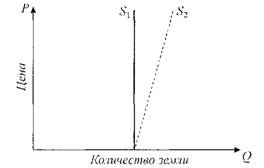 Рис. 9.1. Предложение земли S1 - предложение земли в течение краткосрочного периода; S2 - предложение земли в долгосрочном периоде |