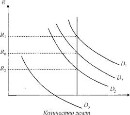 Поскольку предложение земли - фиксированная величина, ренту определяет спрос. на землю. Увеличение спроса с D0 до D1 создаст конкуренцию между арендаторами и повысит ренту с R0 до R1. Напротив, падение спроса на землю с D0 до D2 создаст конкуренцию между землевладельцами и рента снизится с R0 до R2
