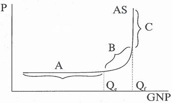 Р – уровень цен; GNP – реальный объем национального производства; AS – кривая совокупного предложения; Qf – потенциальный объем национального производства, т. е. объем производства, достигаемый в национальной экономике при полной занятости всех экономических ресурсов