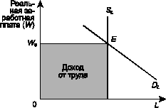 Величина трудового дохода равна площади заштрихованного прямоугольника, или произведению количества труда (числа занятых) и уровня заработной платы. Важным показателем является доля трудового дохода в совокупном (валовом) доходе, который определяется как отношение трудового дохода к совокупному (валовому).