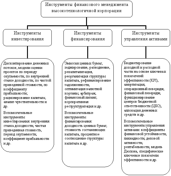 2. Финансовый менеджмент охватывает решение комплекса проблем по трем основным направлениям деятельности корпорации: финансирование, инвестирование и управление активами. Управленческие решения в перечисленных областях требуют индивидуального подхода с учетом отрасли функционирования компании, ее масштабов и особенностей операционных механизмов. Инструменты финансового менеджмента высокотехнологичной корпорации отличает от других хозяйствующих субъектов совокупность специфических характеристик: